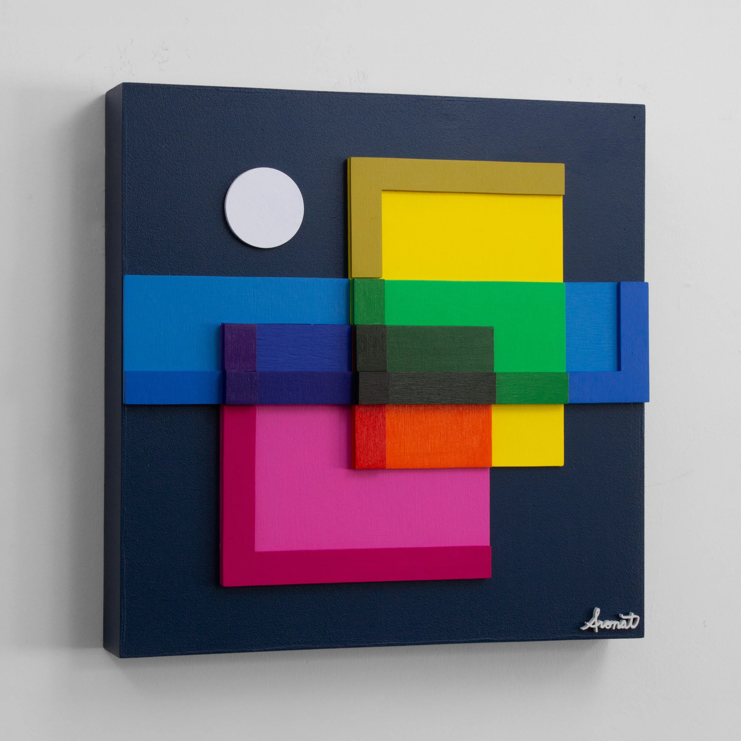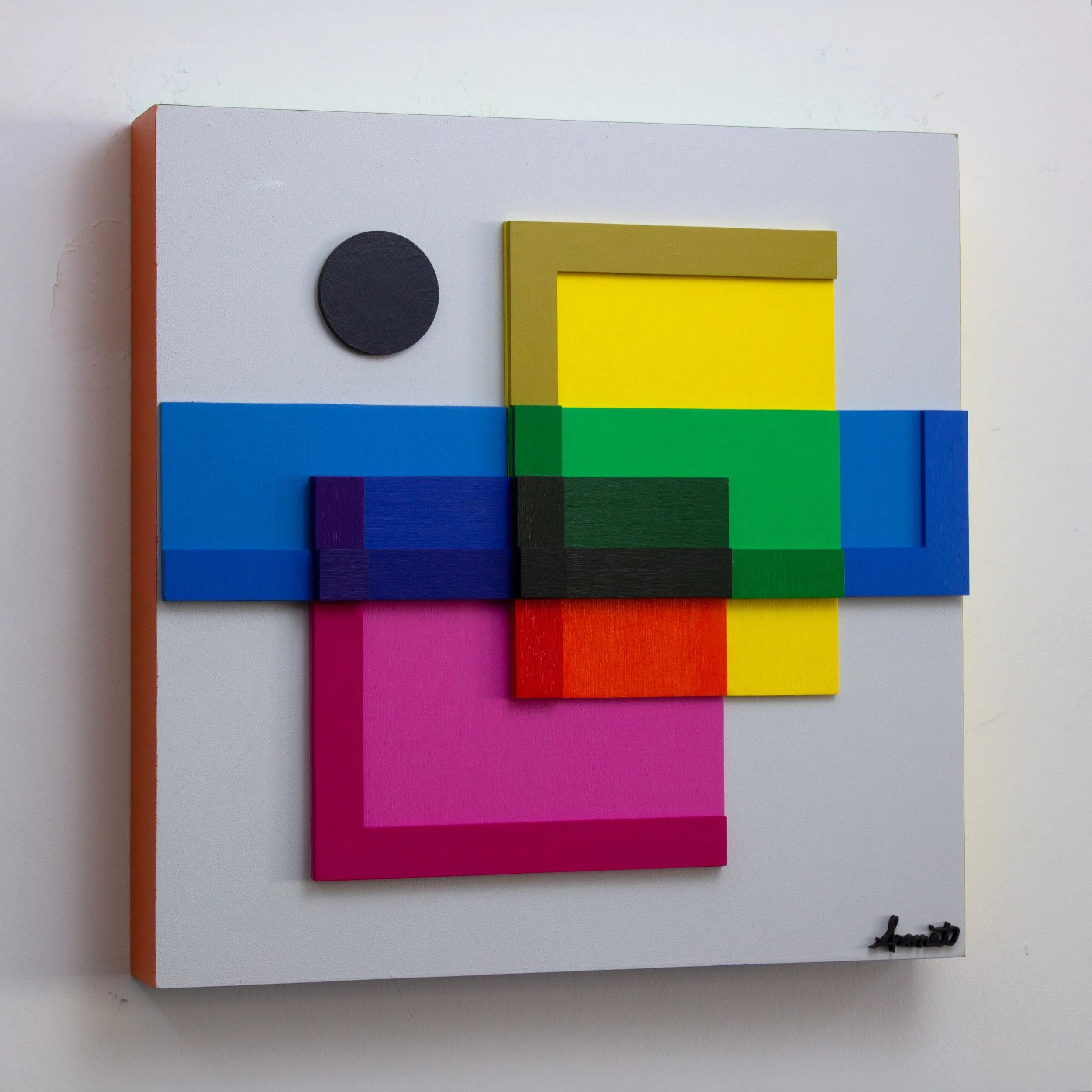 Dimension Iteration lives somewhere between two worlds. It carries the visual language of my Dimension collection, but it takes on its own identity through a CMYK-inspired palette and a shift in the background colors I use. The original Dimension pieces rely on a specific balance of hues, shapes and overlaps, but this variation let me push the idea further. By introducing bolder CMYK-driven color relationships, the composition could sit on backgrounds that the core collection would never allow.