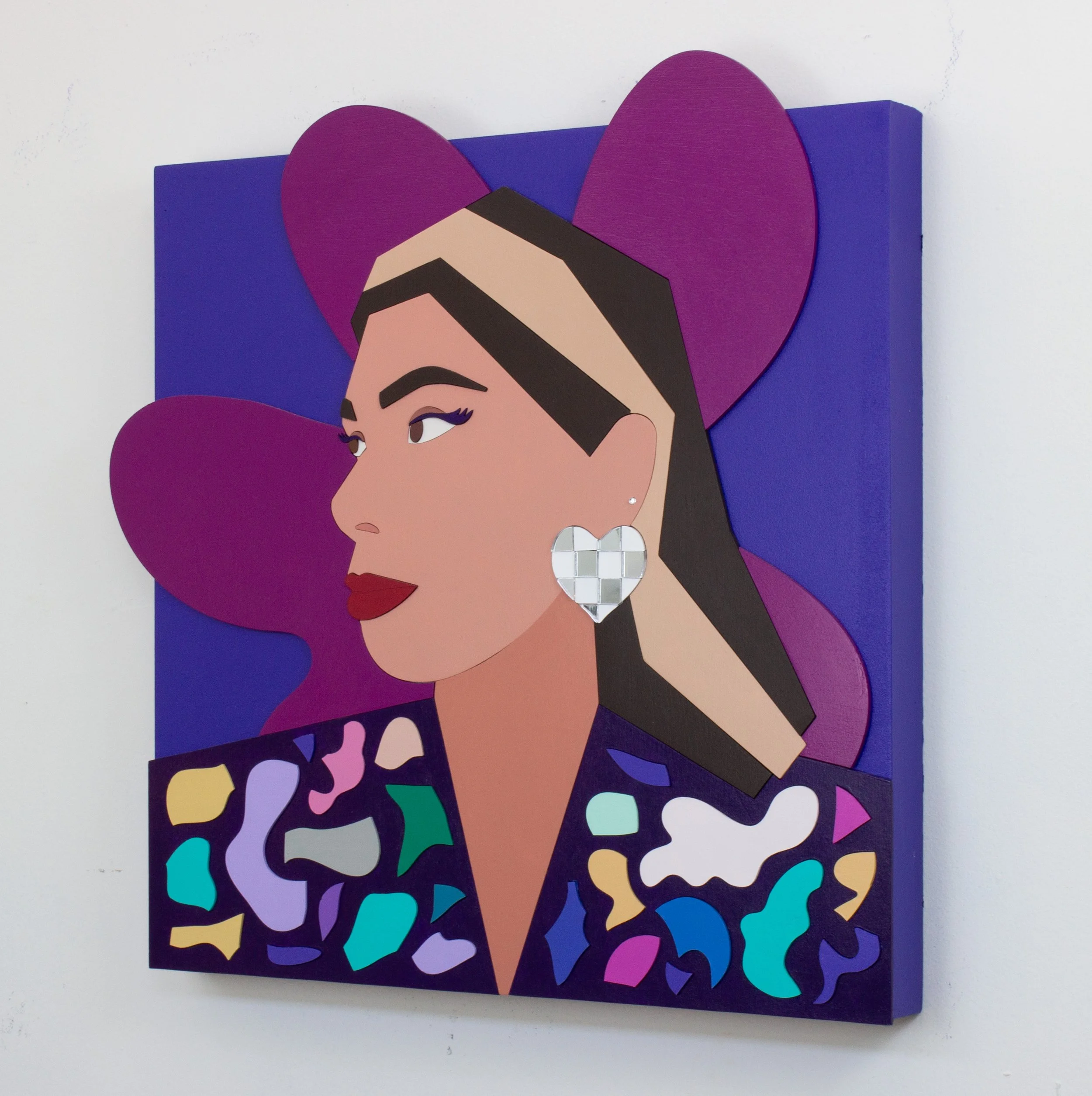 "Self Portrait, Year Two: Still Becoming" is a wooden cut-out design created during my second year as an artist. This piece is an homage to the journey I've taken, incorporating elements from many of the works I've created in that time. The flower crown from my "Dancing Queen" collection sits behind my head, and I'm wearing a mirror heart earring from my self-love collection, which features checkered hearts made from mirror and wood. My shirt is adorned with isolated shapes pulled from various artworks, such as "Rhythm," "Aura," "Dancing Queen," and "Dreams," reflecting the diversity of my creative exploration.